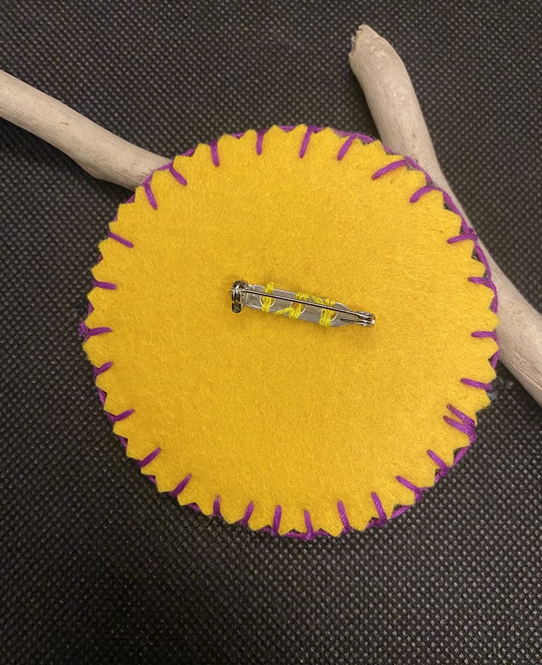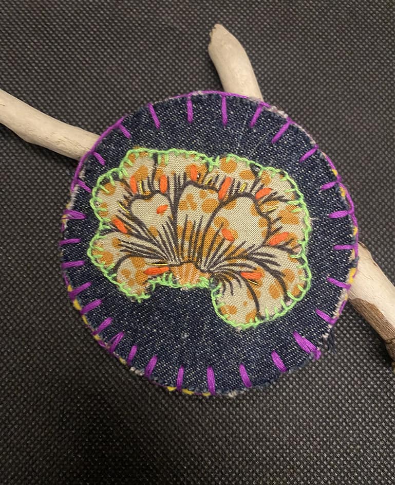 | Matériaux | Face et dos jean et tissu coloré, feutrine. Epingle |