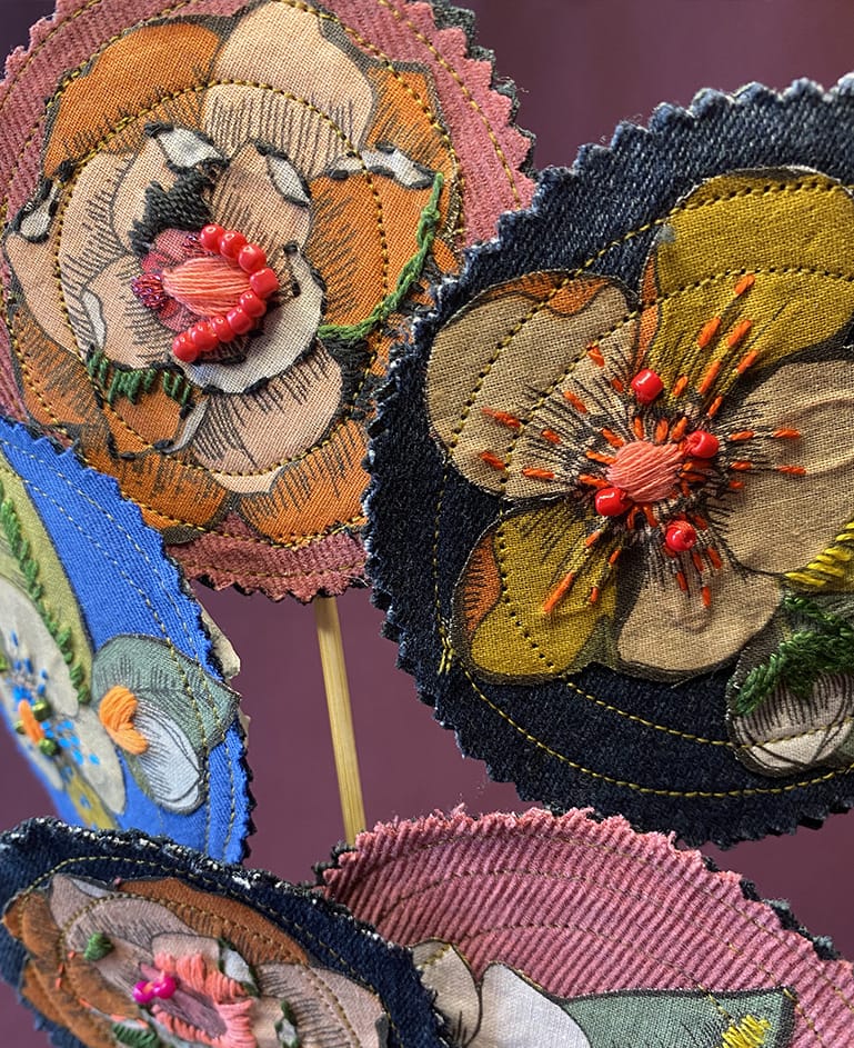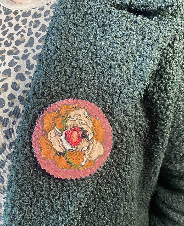 | Matériaux | Tissu et velours upcyclé. Petits détails brodés à la main : fil de coton mouliné et coton perlé et perles de rocaille. |